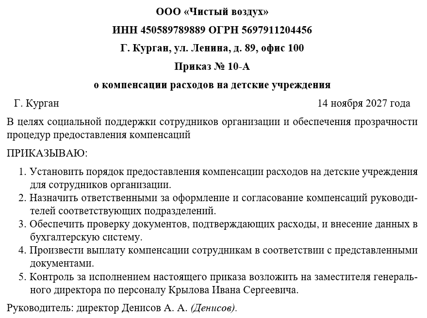 Приказ о компенсации расходов на детские учреждения — это внутренний документ, регламентирующий порядок предоставления сотрудникам организации компенсации расходов, связанных с оплатой детских садов, яслей или иных дошкольных образовательных учреждений. Он направлен на поддержку сотрудников с детьми, обеспечение социальной защиты и повышение лояльности персонала.