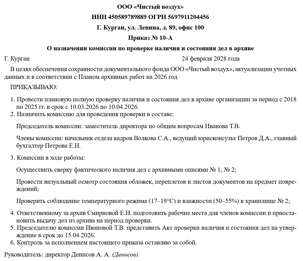 Контроль за исполнением положений приказа возлагается на одного из заместителей руководителя организации или на начальника службы документационного обеспечения управления. Контролирующее лицо обязано следить за соблюдением временных рамок и качеством подготовки итоговых документов. Регулярные отчеты председателя комиссии позволяют руководству оперативно реагировать на выявленные критические нарушения, такие как угроза порчи документов из-за аварийного состояния коммуникаций в хранилище.