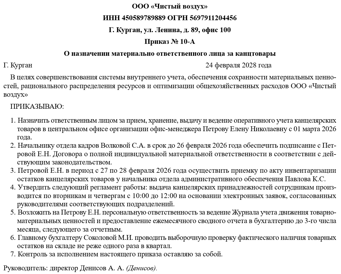 В системе трудового права и внутреннего аудита приказ выполняет функцию официального делегирования исключительных полномочий по управлению частью движимого имущества работодателя. Его суть заключается в закреплении за конкретным должностным лицом персональных обязанностей по приему, надежному хранению и регламентированной выдаче расходных материалов, а также по ведению сопутствующей отчетности, приравненной к первичной документации. Это позволяет высшему руководству полностью делегировать операционные задачи снабжения нижестоящим звеньям, сохраняя при этом инструменты тотального контроля над движением денежных средств, воплощенных в материальных запасах.