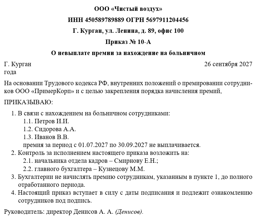 Необходимость приказа обусловлена как практическими, так и юридическими причинами. Часто возникают ситуации, когда сотрудник находится на больничном в течение отчетного периода. В таких случаях начисление премии за полный отчетный период может противоречить внутренним положениям организации о премировании и привести к финансовым ошибкам или конфликтам с персоналом. Приказ позволяет формализовать основания для невыплаты премий, определить ответственных лиц за контроль исполнения документа и документально зафиксировать решение руководства.