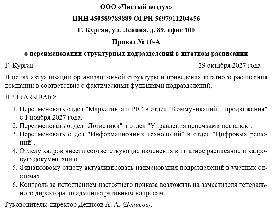 Приказ о переименовании подразделений обеспечивает официальное закрепление новых наименований, их отражение в кадровых и финансовых документах, а также информирование сотрудников.