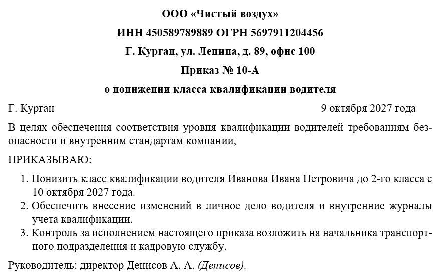 При составлении приказа необходимо указать: полное наименование компании, дату и место издания, данные водителя, его прежний и новый класс квалификации, дату вступления изменений в силу, а также должность и подпись генерального директора.