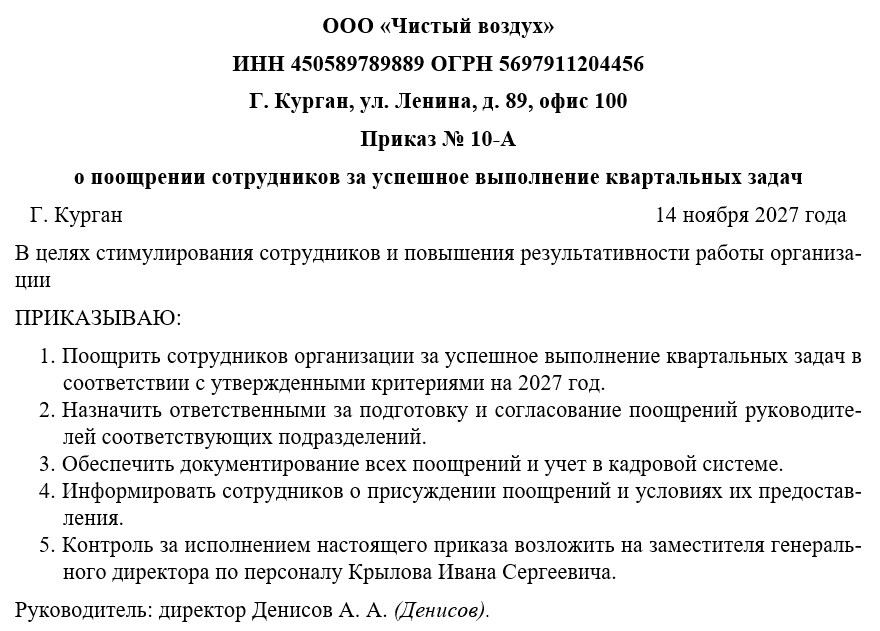 Распоряжения оформляются отдельными строками, без нумерации и пустых строк, с ясными и однозначными формулировками. В конце приказа указываются лица, ответственные за контроль исполнения, и ставится подпись руководителя. При необходимости приказ может сопровождаться приложениями с перечнем сотрудников и формой учета поощрений.