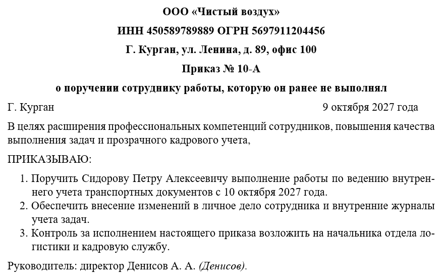 Приказ о поручении работы служит официальным документом, фиксирующим решение руководства, порядок контроля и ответственность за выполнение новых функций. Он защищает как права компании, так и права сотрудника, создавая прозрачность и формализованность процесса изменения функционала.