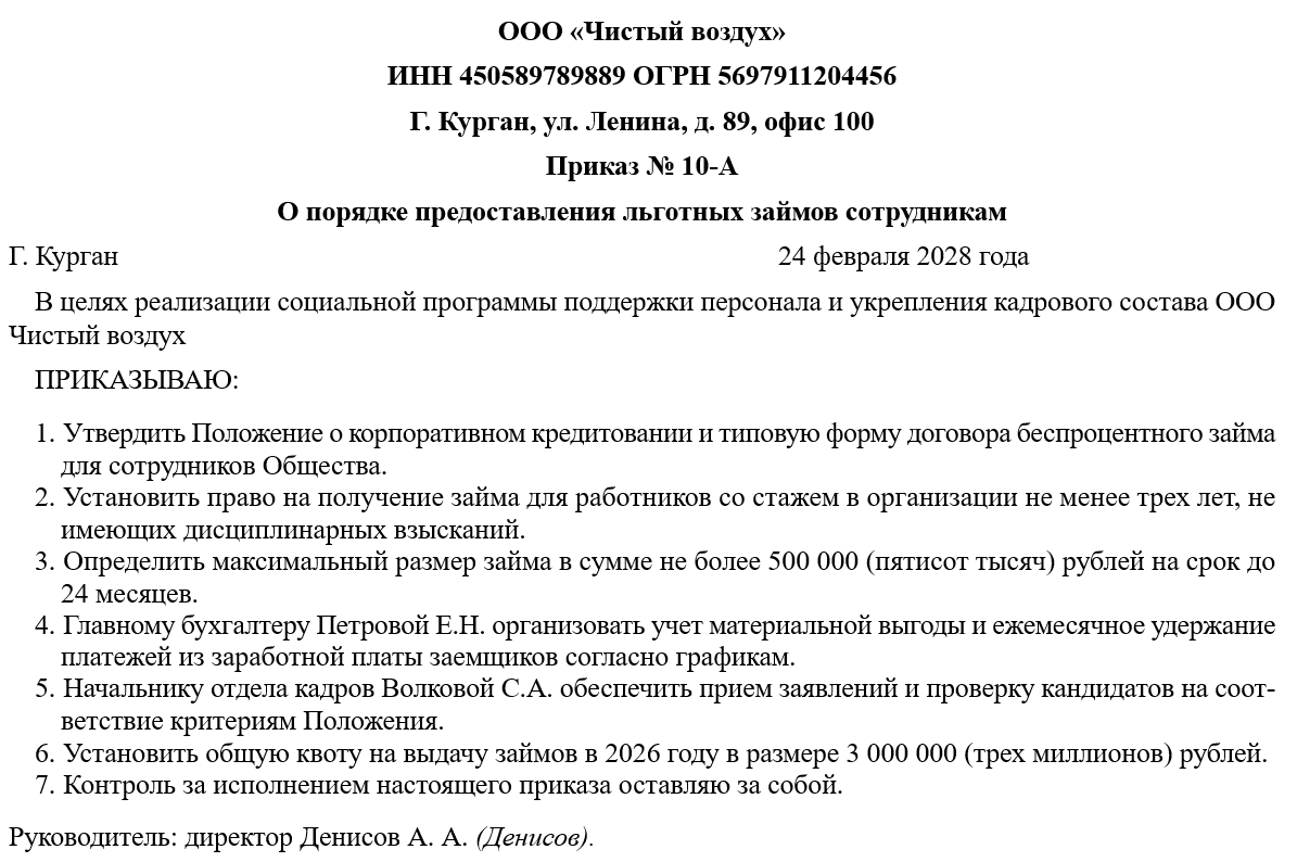 Юридически приказ закрепляет правовой статус займа как возвратной финансовой помощи, четко отделяя его от оплаты труда. Это минимизирует риски признания выплат скрытыми премиями со стороны налоговых органов и создает прозрачный механизм управления дебиторской задолженностью персонала.