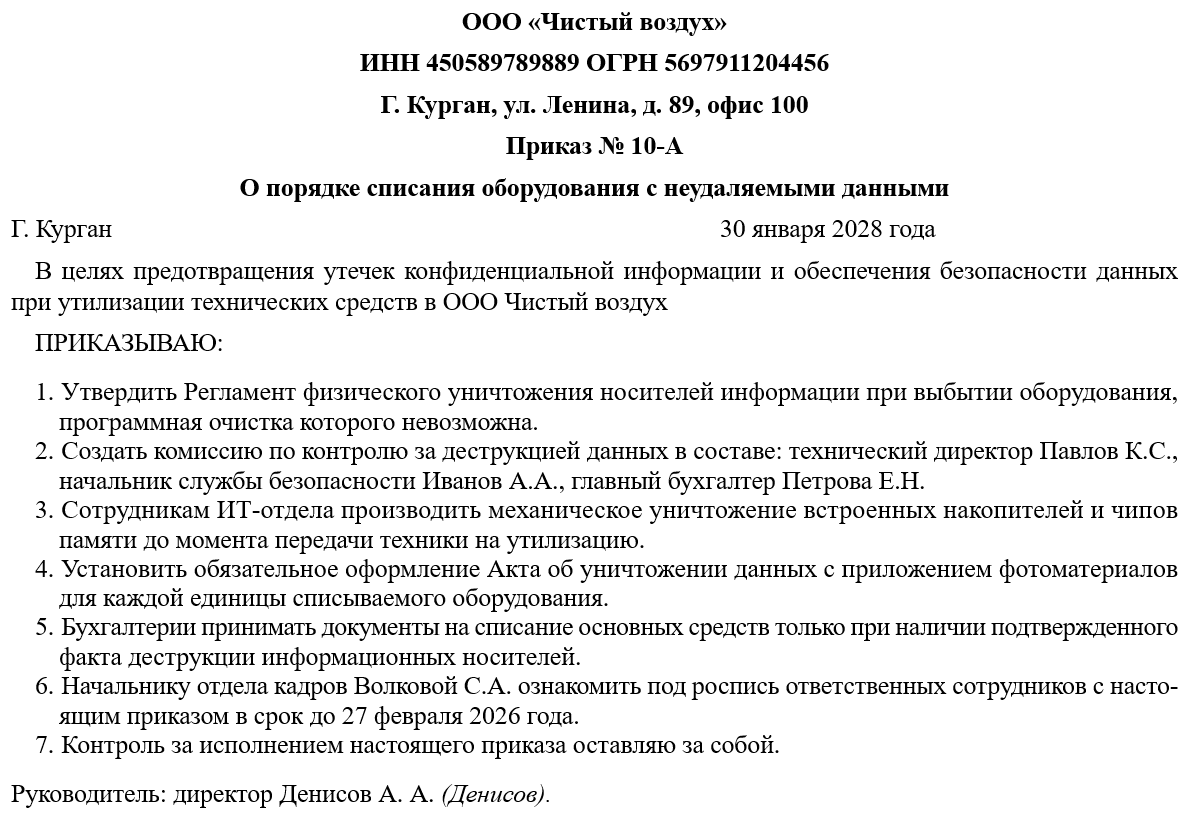 Приказ о порядке списания оборудования с неудаляемыми данными является локальным нормативным актом, регламентирующим процедуру безопасного выбытия технических средств. Документ служит правовым инструментом для защиты конфиденциальной информации на этапе прекращения эксплуатации материальных активов.
