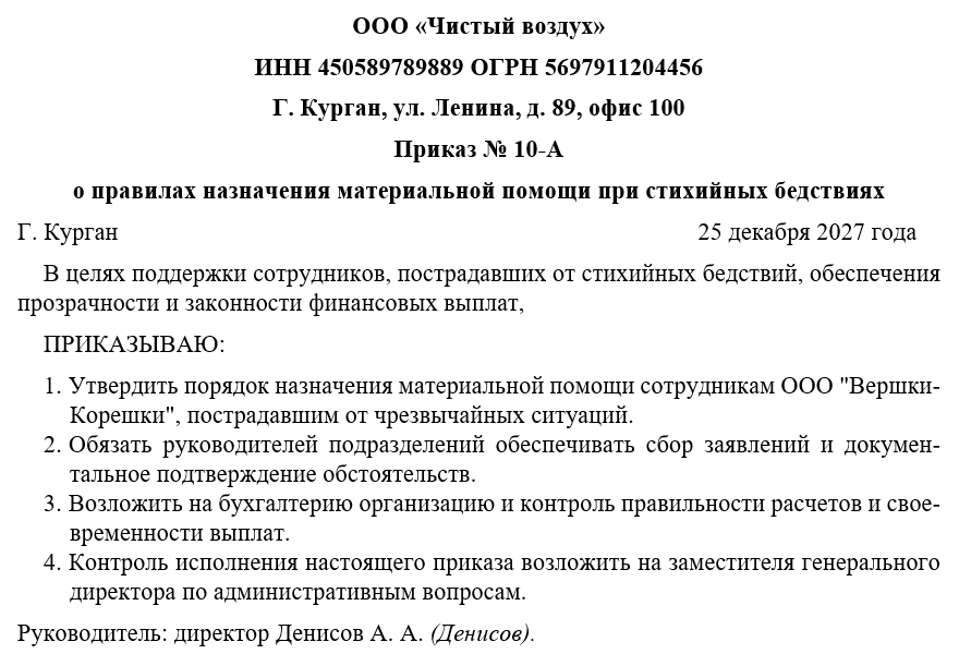 Приказ оформляется на бумажном носителе на фирменном бланке организации либо на листе формата А4. В верхней части по центру размещается слово «ПРИКАЗ», ниже указывается тема документа с формулировкой «о правилах назначения материальной помощи при стихийных бедствиях».