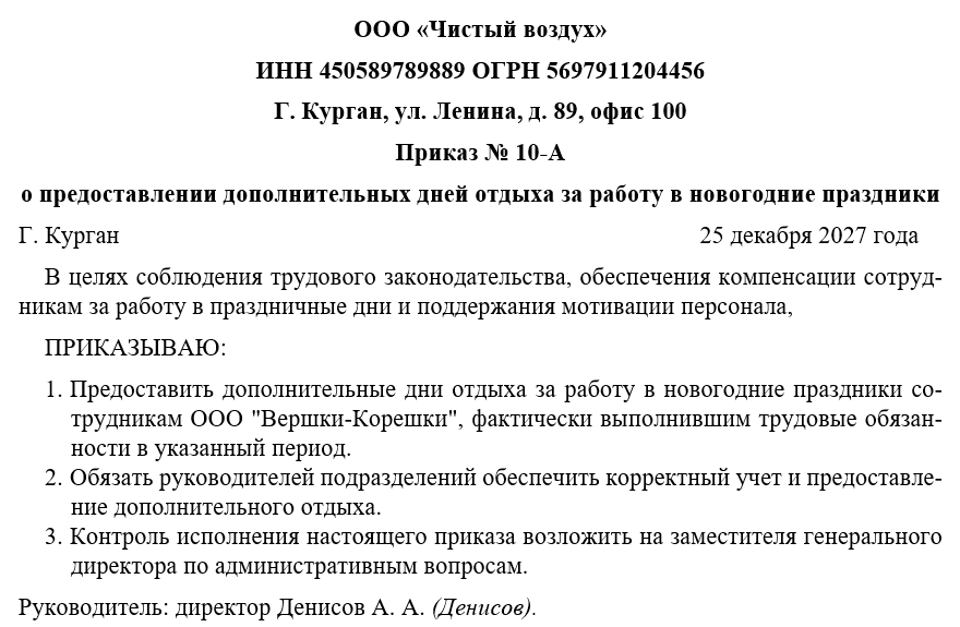 Предоставление дополнительных дней отдыха является формой компенсации за работу в праздничные дни и направлено на обеспечение соблюдения норм трудового законодательства, сохранение трудовой мотивации и поддержание эффективного функционирования организации. Утверждение приказа позволяет формализовать процесс учета времени работы в праздничные дни, исключить недоразумения и гарантировать равное применение правил ко всем сотрудникам, участвующим в работе в праздничный период.
