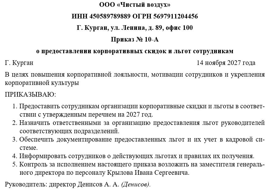 Приказ о предоставлении корпоративных скидок и льгот сотрудникам — это управленческий документ, закрепляющий внутренние правила предоставления специальных условий для работников компании на товары, услуги и участие в мероприятиях. Он направлен на укрепление корпоративной культуры, повышение мотивации персонала и формирование лояльного отношения сотрудников к организации.