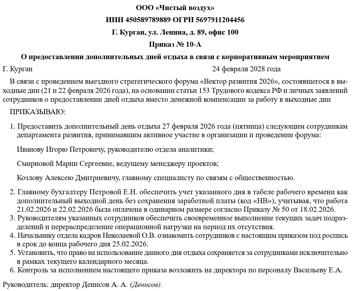 Это дисциплинирует коллектив и создает ощущение справедливости, так как правила предоставления отдыха становятся едиными и прозрачными для всех участников мероприятия. Более того, наличие таких приказов в истории компании является весомым аргументом при проведении аудита корпоративной культуры и оценки уровня социальной ответственности работодателя.