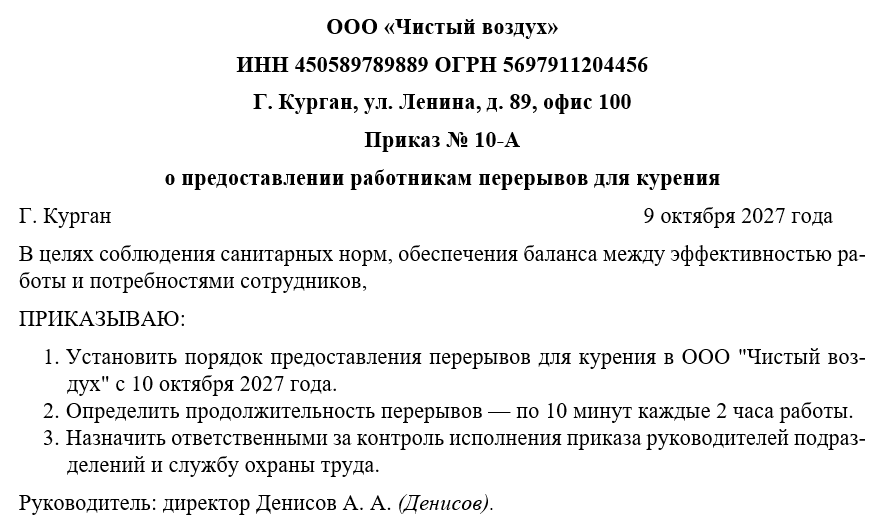 Приказ должен четко определять продолжительность перерывов (например, 10 минут каждые 2 часа работы ), места для курения и порядок их использования. Нарушение установленного порядка может быть основанием для дисциплинарного взыскания.