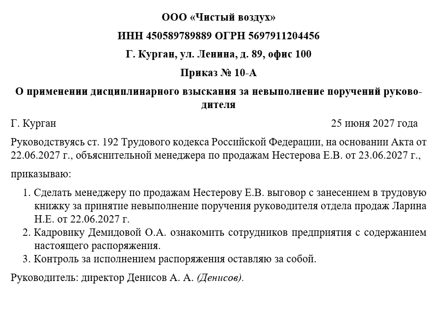 Скачать пустой бланк приказа о применении дисциплинарного взыскания за невыполнение поручения руководителя .docxСкачать образец приказа о применении дисциплинарного взыскания за невыполнение поручения руководителя .docx