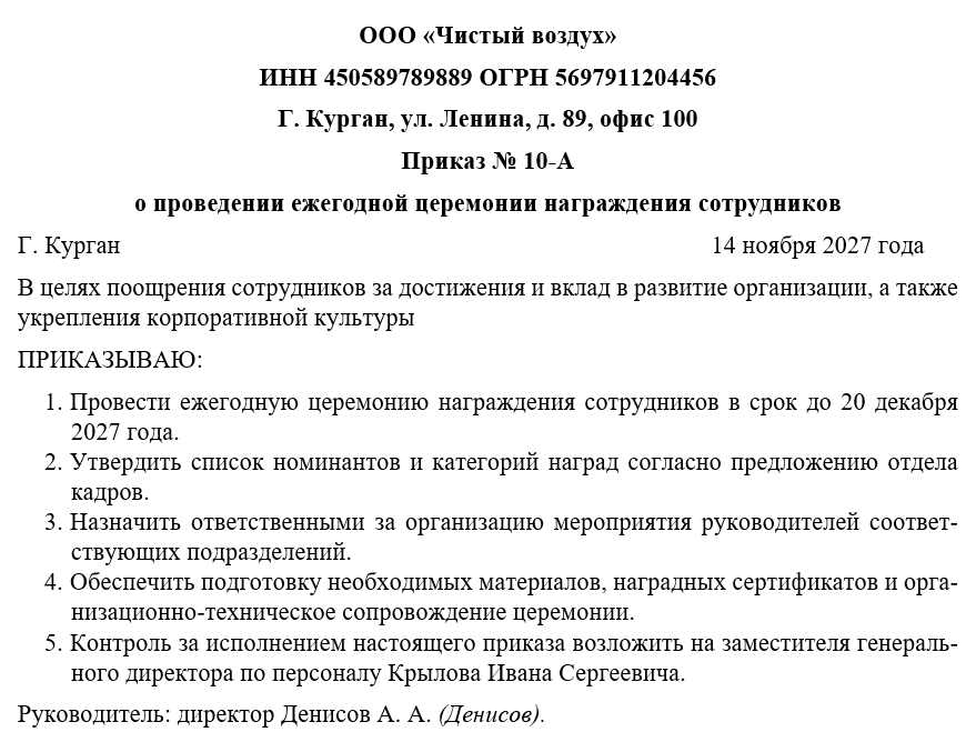 Распоряжения должны быть оформлены отдельными строками, без нумерации и пустых строк, с ясными и однозначными формулировками. В конце приказа указываются лица, ответственные за контроль исполнения, и ставится подпись руководителя организации. При необходимости приказ может быть дополнен приложениями, включая список номинантов, регламент церемонии и формы документации.