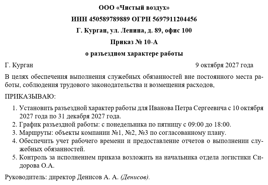 Цель издания приказа заключается в официальном закреплении условий разъездной работы, распределении обязанностей и организации контроля. Приказ позволяет: