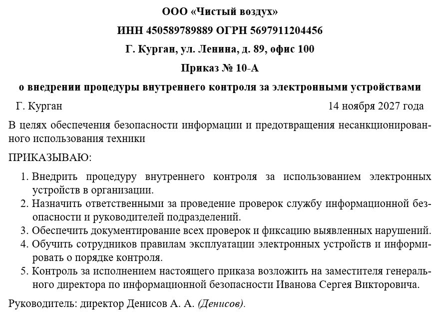 Приказ о внедрении процедуры внутреннего контроля за электронными устройствами — это внутренний документ, устанавливающий порядок проверки и контроля использования служебных компьютеров, смартфонов, планшетов и других электронных устройств, предоставленных сотрудникам для работы. Процедура направлена на обеспечение безопасности информации, предотвращение несанкционированного доступа и минимизацию рисков утечки конфиденциальных данных.