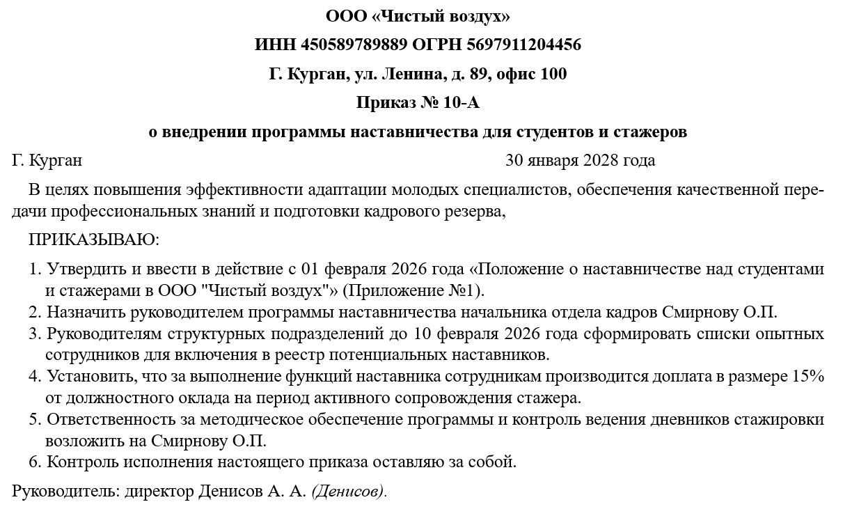Внедрение данного приказа обусловлено стремлением организации повысить качество подготовки будущих сотрудников еще на этапе их обучения или прохождения практики. Программа наставничества минимизирует риски ошибок, связанных с отсутствием опыта, сокращает период адаптации стажеров и способствует формированию лояльности к бренду работодателя с первых дней работы.