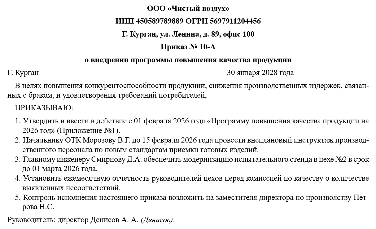 Данный приказ формализует переход организации к системному управлению качеством, переводя этот процесс из разряда эпизодических проверок в формат непрерывного совершенствования всех производственных и управленческих циклов. Документ закрепляет правовую и организационную основу для внедрения новых стандартов, модернизации технологических линий и трансформации корпоративного мышления сотрудников в сторону персональной ответственности за конечный результат.