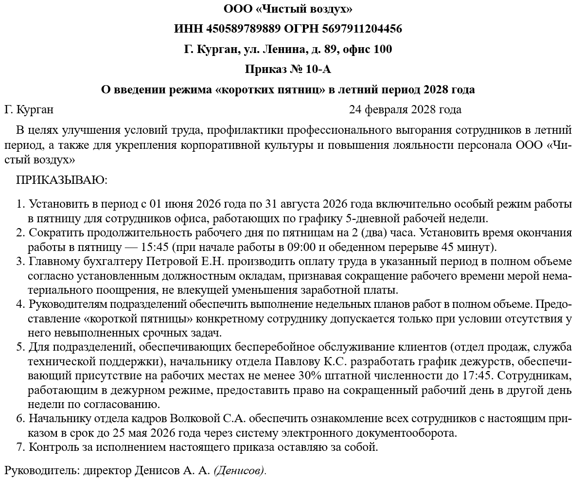Приказ о введении «коротких пятниц» в летний период года — это социально-ориентированный локальный нормативный акт, регулирующий временное изменение режима рабочего времени в целях повышения лояльности персонала и профилактики профессионального выгорания. Документ легитимизирует сокращение продолжительности рабочего дня накануне выходных, создавая условия для полноценного отдыха сотрудников в период благоприятных климатических условий. В современной управленческой практике «короткая пятница» рассматривается не как снижение трудовой дисциплины, а как инструмент стратегического HR-брендинга, позволяющий организации конкурировать за таланты через улучшение баланса между работой и личной жизнью.
