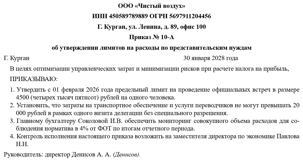 Приказ о введении лимитов на расходы по представительским нуждам является ключевым инструментом финансового планирования и налогового контроля внутри организации. В современной практике ведения бизнеса представительские расходы часто становятся объектом пристального внимания налоговых органов, поскольку они напрямую влияют на базу по налогу на прибыль. Данный документ формализует процесс осуществления затрат, связанных с официальным приемом и обслуживанием представителей других организаций, участвующих в переговорах. Утверждение четких лимитов позволяет предприятию не только рационально распределять оборотные средства, но и обеспечивать юридическую обоснованность расходов в соответствии со статьей 264 Налогового кодекса РФ. Приказ закрепляет переход от ситуативного финансирования встреч к системному управлению имиджевыми и коммуникационными затратами, что повышает общую прозрачность финансово-хозяйственной деятельности предприятия.