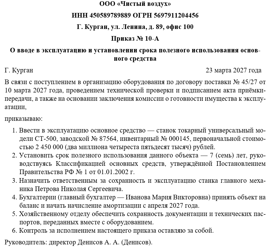 Кроме того, приказ фиксирует ответственность конкретных лиц за сохранность имущества, правильность его использования и проведение регулярного технического обслуживания. Установленный срок полезного использования служит ориентиром для бухгалтерии в вопросах амортизационных начислений, а для руководства компании — в оценке эффективности эксплуатации объекта и планировании будущих инвестиций.
