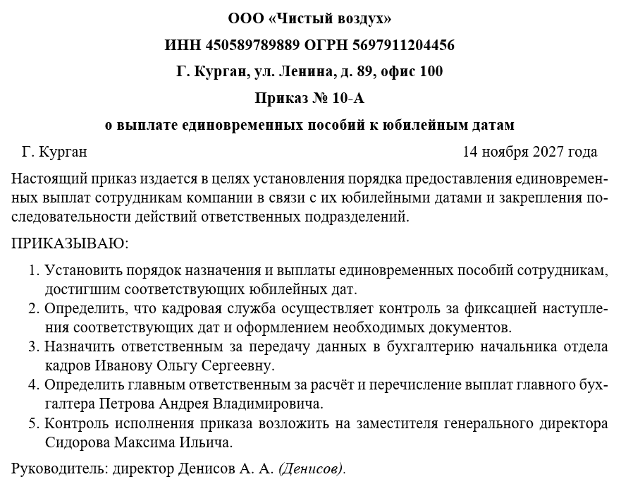 Потребность в подобном документе возникает в ситуациях, когда компания стремится закрепить механизм поощрения сотрудников, достигающих определенных юбилейных возрастов или значительных трудовых сроков. В отсутствие установленного порядка возможны разнотолки при определении размера пособия, сроков его выплаты и круга лиц, имеющих право на получение указанной меры поддержки, что создает предпосылки для конфликтов и неоднозначных толкований. Приказ позволяет устранить эти риски и выстроить структурный процесс, в котором каждый участник кадровой системы понимает свои обязанности и полномочия.