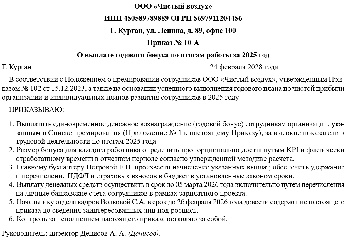 Юридическая база документа опирается на статью 191 Трудового кодекса РФ, которая наделяет работодателя правом поощрять работников, добросовестно исполняющих свои трудовые обязанности. Важно учитывать, что годовой бонус может носить как стимулирующий характер (если он зафиксирован в локальных нормативных актах как обязательная часть оплаты труда), так и характер разового поощрения по решению руководства. Четко сформулированный и обоснованный приказ сводит к минимуму риски возникновения трудовых споров и претензий со стороны контролирующих органов. Он позволяет юридически грамотно обосновать экономическую целесообразность выплат, что дает возможность бухгалтерии включить эти суммы в расходы на оплату труда, тем самым оптимизируя налогооблагаемую базу по налогу на прибыль.