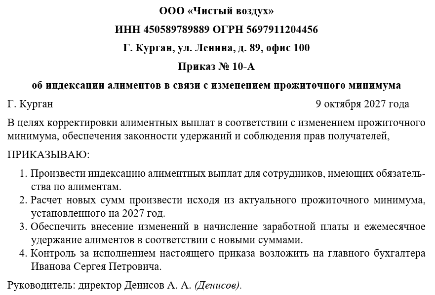 Приказ оформляется на официальном бланке организации, подписывается руководителем и содержит: цели индексации, порядок пересчета алиментов, сроки вступления изменений, ответственных лиц за контроль исполнения.