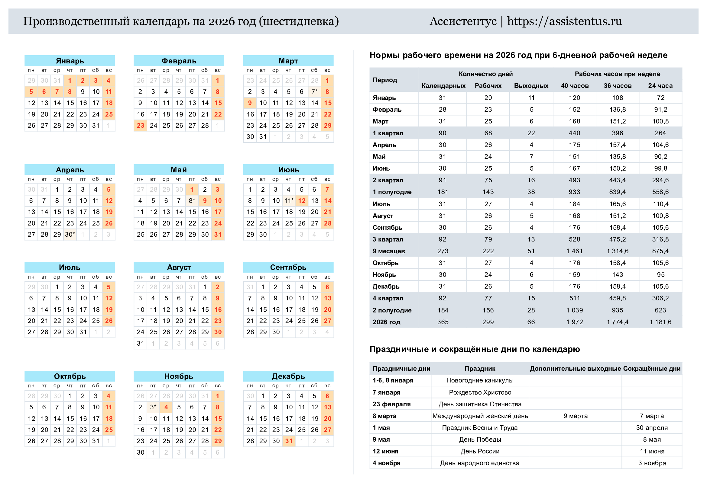 Производственный календарь на 2026 год при 6-дневной рабочей неделе по кварталам